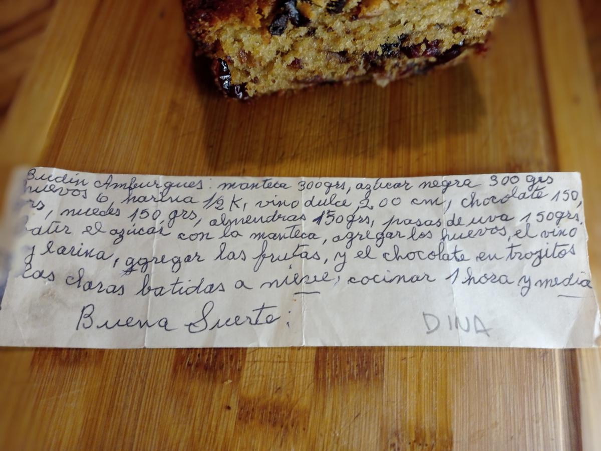 Trate de imaginar como ella haría el budin, y lo fui haciendo despacio, paso a paso, tratando de buscar en lo más profundo de mi historia los consejos que me diera de cocina , fueron pocos pero bastaron para sentir la presencia de Dina, feliz y orgullosa que aquella jovencita de veinti tantos, hoy con su papelito en las manos haga su budin, y reviva por unos minutos, los aromas, los sabores que me regaló con sus platos y el abrazo que me daba al despedirse.