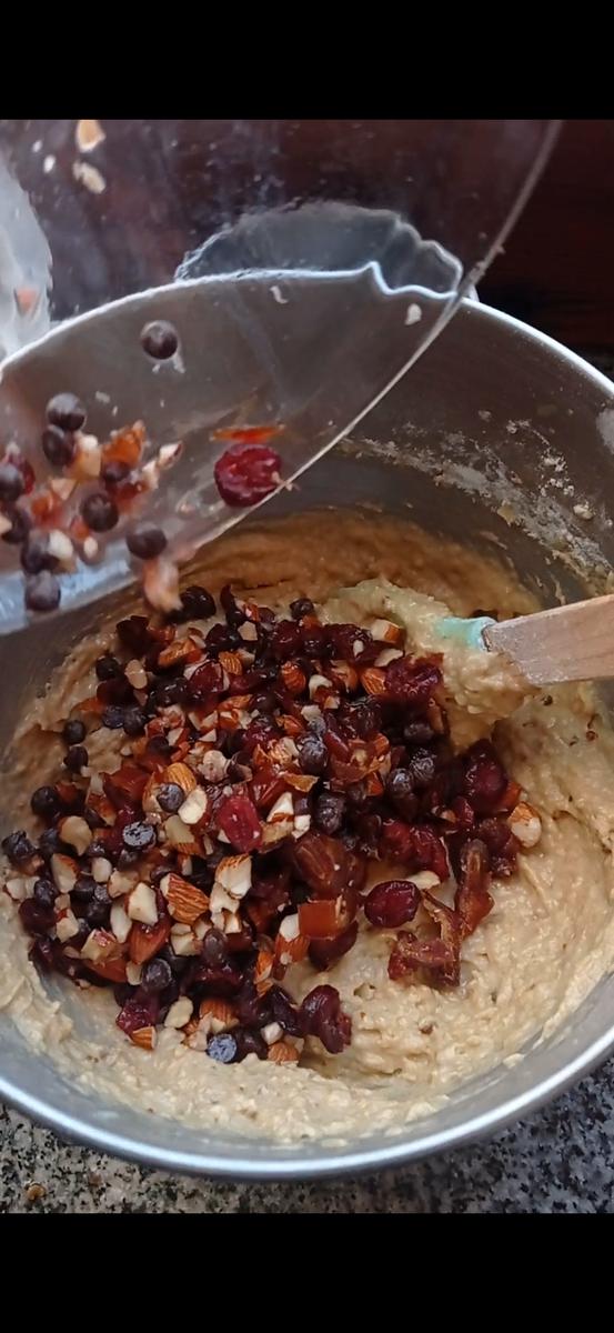 Sumar los frutos secos y el chocolate picado, reservar un poquito de chocolate para poner encima