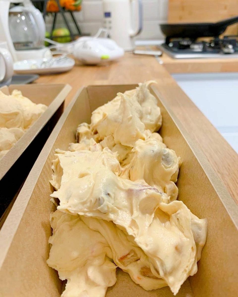Verter en dos moldes de budín (yo utilicé dos de 24X6) que estarán enmantecados y enharinados o en su defecto forrados con papel de horno.