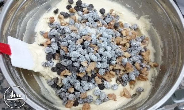 - Escurrimos las pasas y junto a los demás frutos secos los espolvoreamos con un poco de harina para que cuando se cocine el budín no se queden en el fondo del mismo.