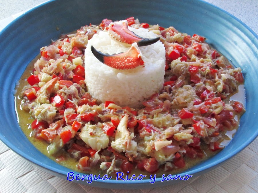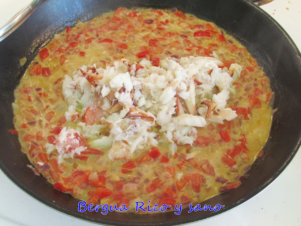 4. Cuando la salsa esté espesa a nuestro gusto probamos de sazón por si hubiera que rectificar. Incorporamos la carne de buey de mar a la sartén y le damos 3-4 minutitos, no más para que no se quede seco.