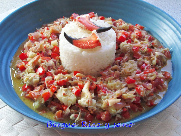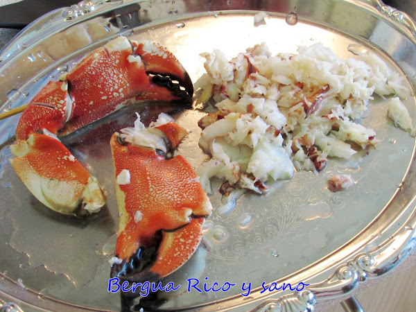 Esta es una forma deliciosa y distinta de comer marisco. Cuando el marisco es fresco, con un hervor y tal vez un chorro de limón, sobran las palabras. Pero desde que vivo en Dinamarca, me encuentro con que el marisco que nos llega es sobre todo congelado. Y de ahí que empezara a inventarme platos sabrosos para reanimar al cangrejo en cuestión y a cualquiera que lo pruebe. De hecho confieso que la salsa quedó tan buena, ¡que rebañamos la sartén con el dedo! Para 2 personas: