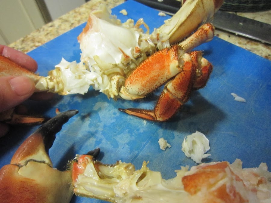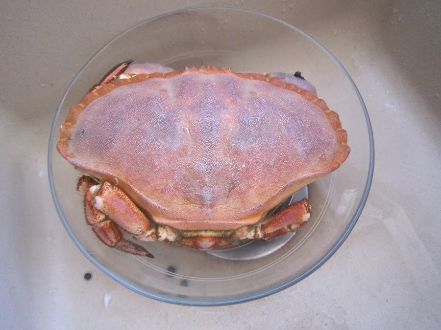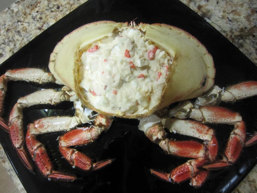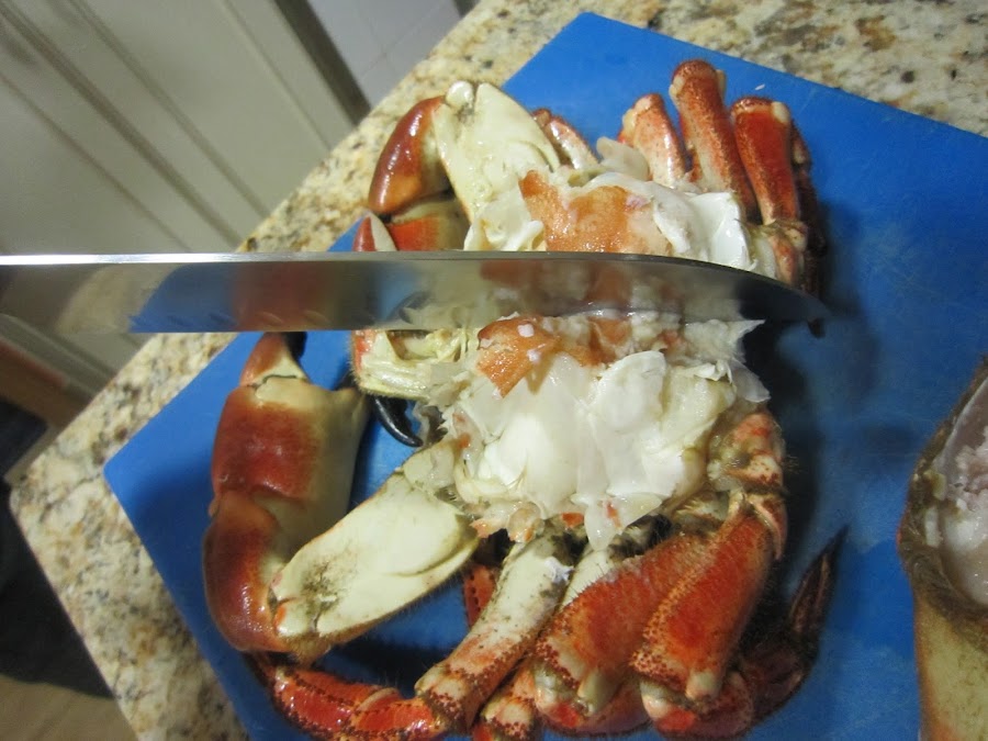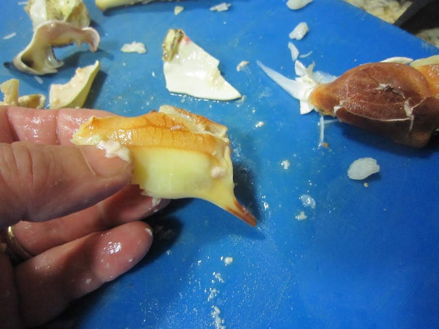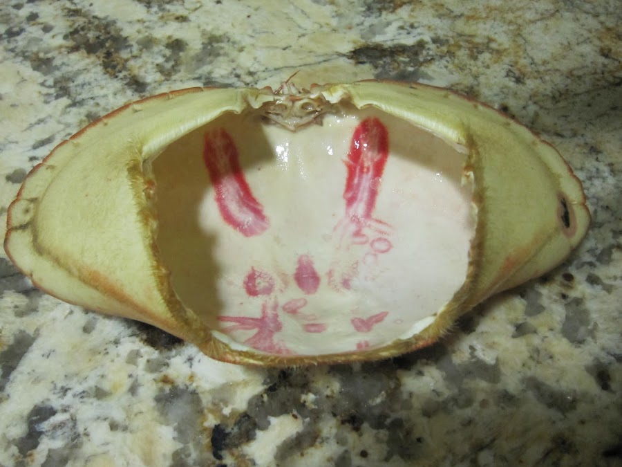 Limpiar el caparazón por dentro, sacar las huevas (era hembra) y las partes comestibles. Hay una especie de telillas y una bolsa justo debajo de la boca, que hay que tirar.