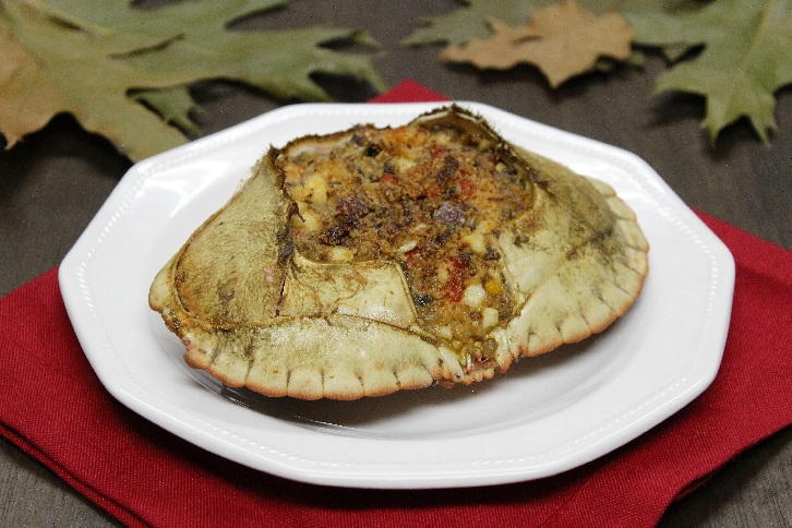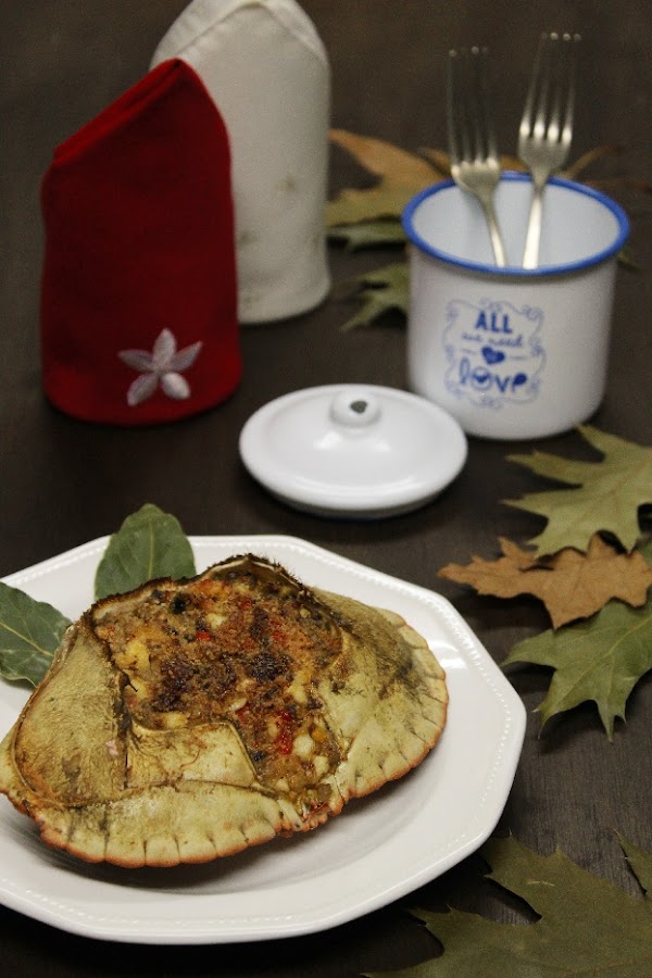 4. Rellenamos el caparazón de los bueyes con la mezcla anterior. Espolvoreamos con pan rallado y llevamos al horno unos minutos para que se doren.