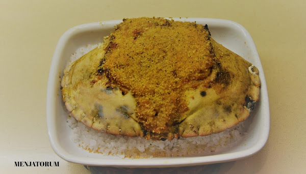 En una fuente para horno preparar una cama de sal gruesa, colocar el caparazón del buey de mar , bien limpio.