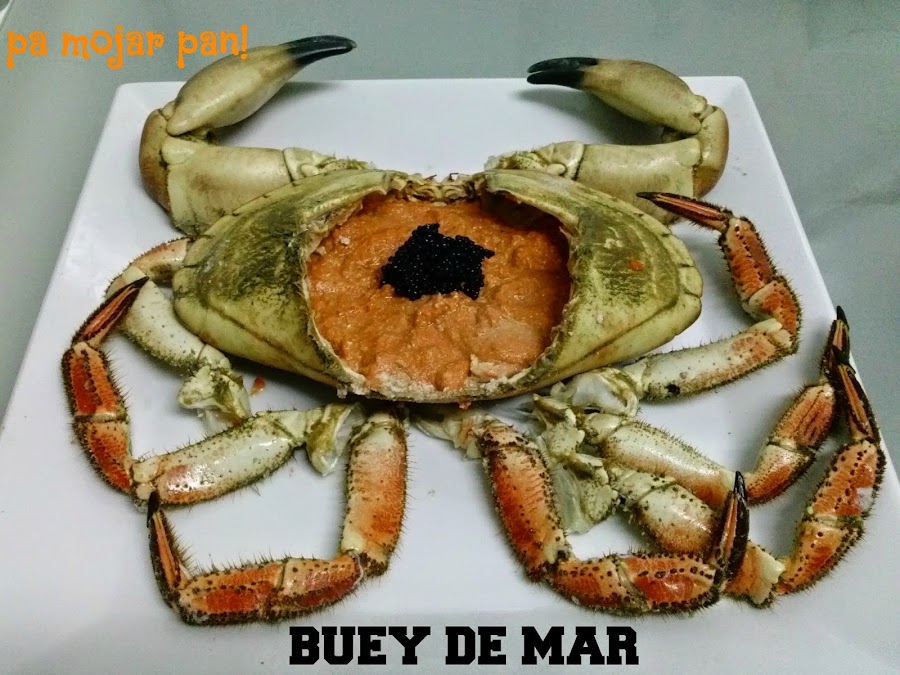 Pasado este tiempo sacamos el buey de mar y dejamos enfriar. Luego retiramos las patas y abrimos el cuerpo. Extraemos todos los jugos y toda la carne del interior con ayuda de una cuchara y lo pondremos en un bol. Añadiremos una cucharada de mostaza, otra de mayonesa y un chorrito de coñac. Removemos bien y volvemos a introducir en el caparazón. Decoramos por encima con una cucharadita de huevas de lumpo.