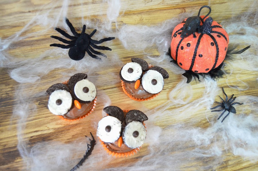 Cuando estén frías le ponemos una capa de nocilla de almendras. Abrimos las galletas de oreo, la cara que no tiene nada de crema las partimos por la mitad para hacer las cejas, y las que tienen la crema serán los ojos.