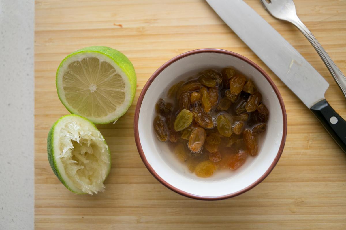 Las pasas son totalmente opcionales, pero me encanta el toque que le da al plato al estar infusionadas en el jugo de limón.