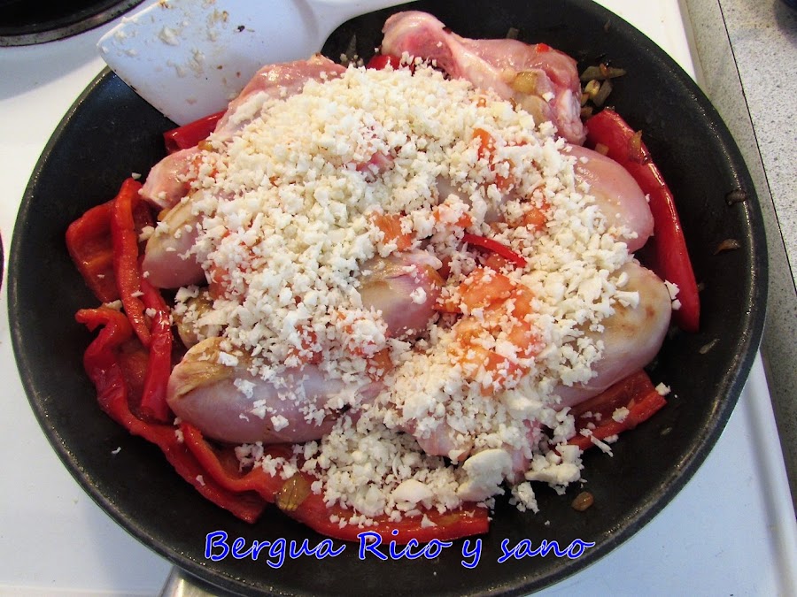 3. Entonces añadimos el tomate troceado (con piel) y la coliflor rallada o desmenuzada en la trituradora (queda como cuscús) y le damos unas vueltas.