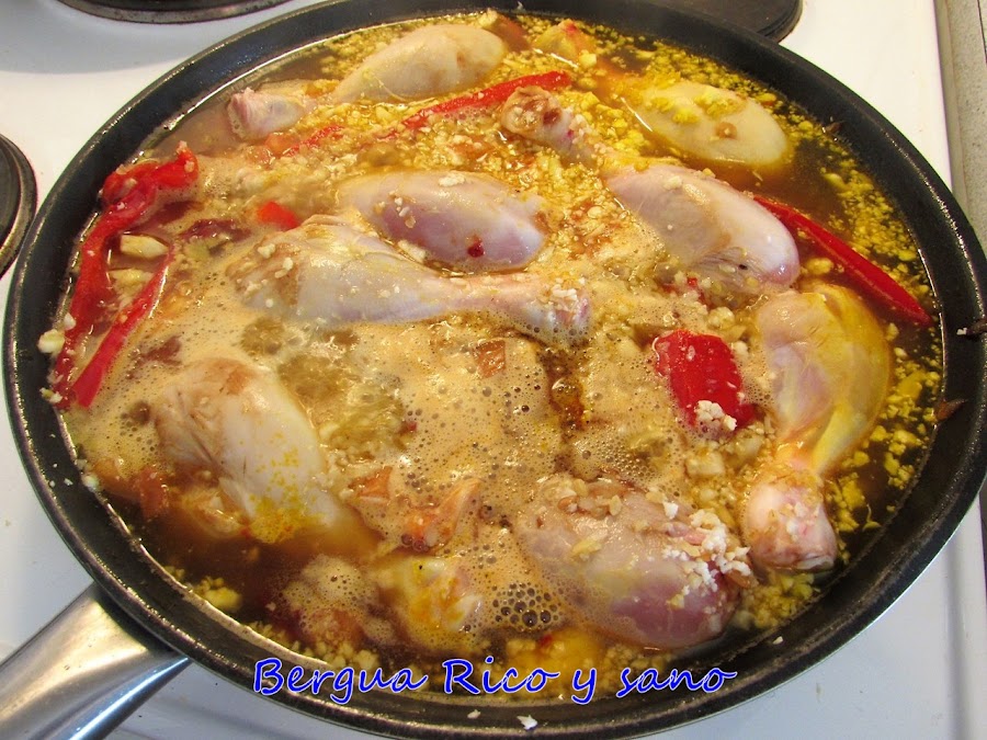 2. Cuando las verduras estén medio tiernas y hayan tomado color, añadimos el pollo y removemos para que coja algo de color por fuera.