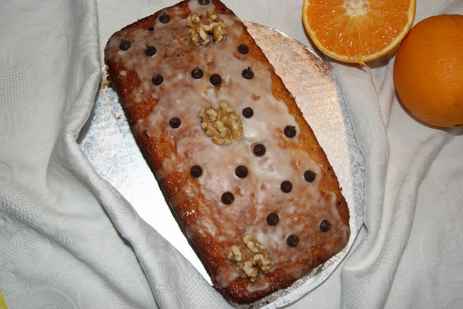 11) Cuando esté completamente frío, le aplicamos el glaseado, para ello mezclamos el azúcar glas con el zumo de naranja y lo echamos por encima. Podemos adornar con más chips de chocolate, frutos secos, etc. deja volar tu imaginación y disfruta.