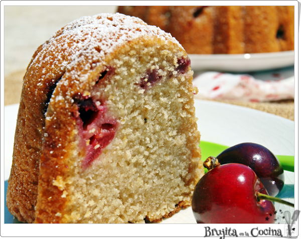 Por último añadimos las cerezas que hemos cortado en cuartos junto con la ralladura y una cucharadita de harina para que no se nos vaya al fondo del bizcocho y se reparta bien por todo él.