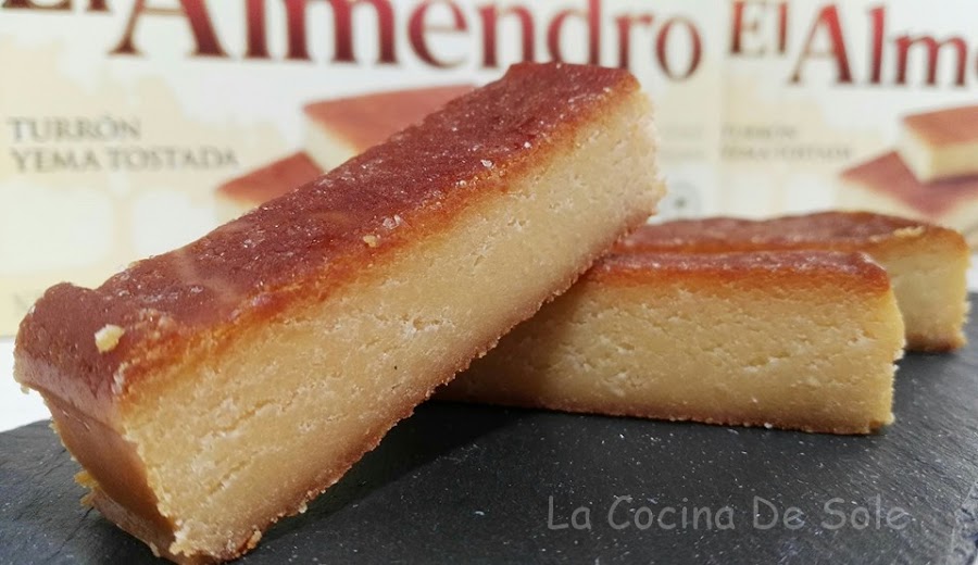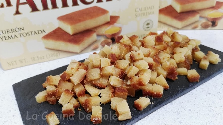 He utilizado para mi receta turrón de yema tostada de El Almendro, elaborado con almendras y yema de huevo, logrando un sabor único, que a su vez tostado se convierte en un producto muy apreciado por su delicado sabor y textura suave.