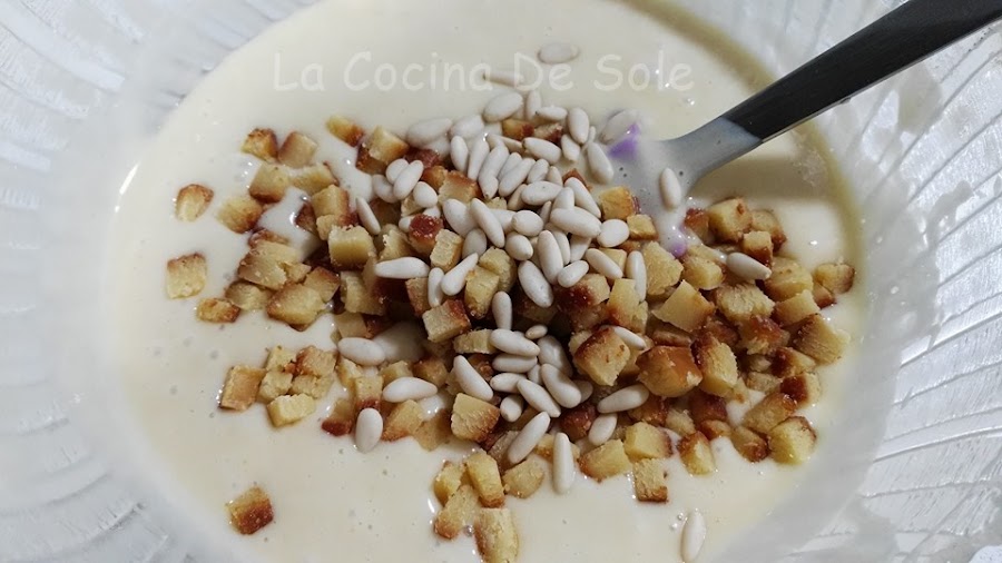Una vez, bien mezclado todo, le añadimos el turrón troceado junto con los piñones.