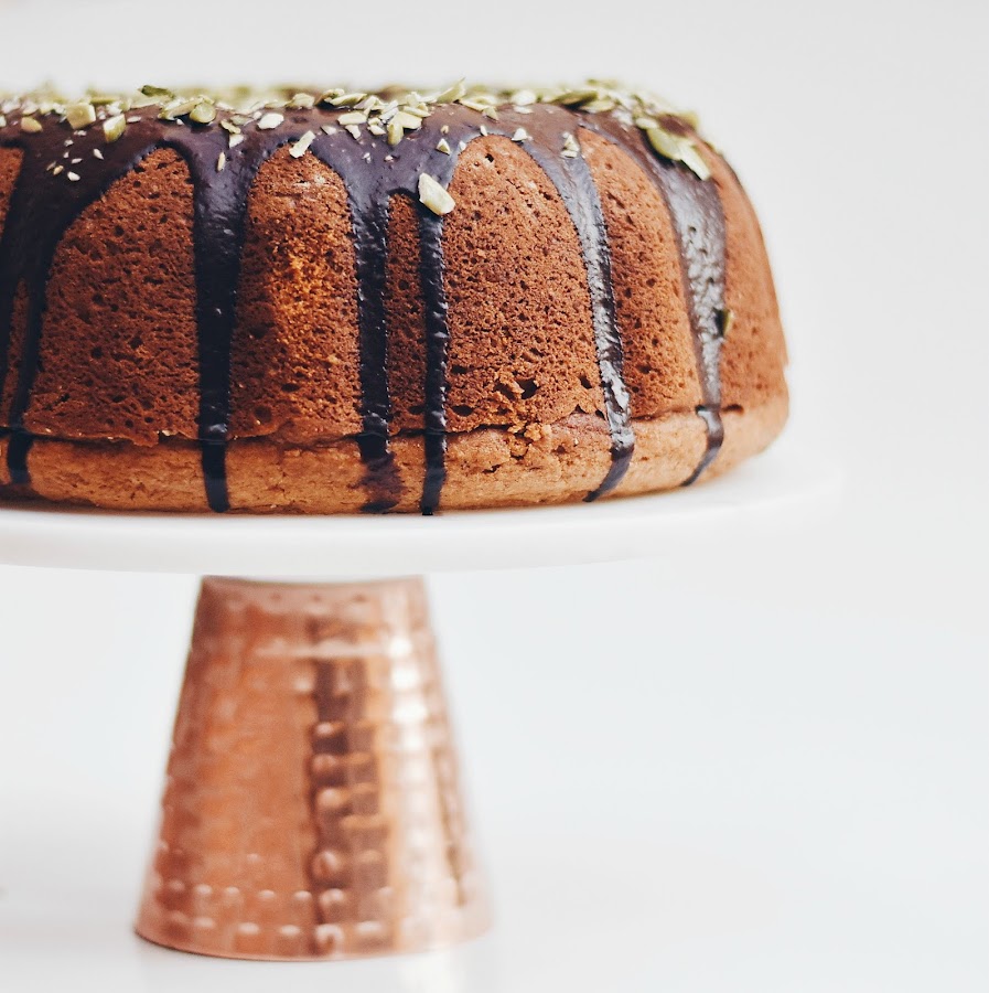 Pasamos el bundt cake a un pedestal o un plato. Esparcimos el glaseado de chocolate, y decoramos con las semillas de calabaza.