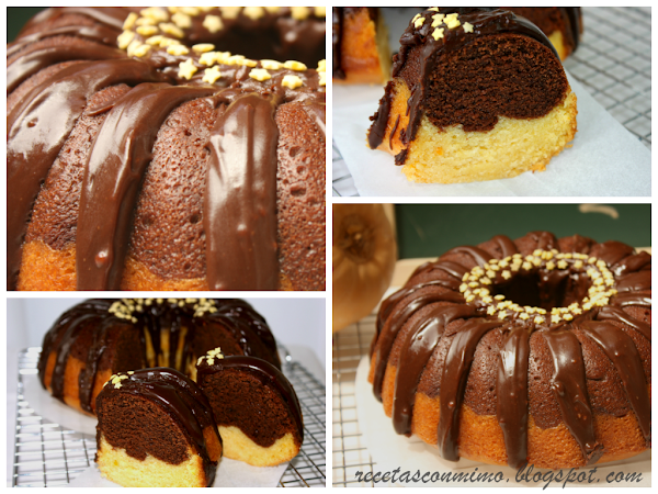 9 - Mientras termina de enfriar preparamos el glaseado de chocolate. Deshacemos el chocolate con la mantequilla al baño maría, removiendo de vez en cuando. Una vez deshecho lo retiramos del fuego, le añadimos la leche y removemos bien. Ahora echamosel azúcar glas y mezclamos. Decoramos el bundt al gusto y disfrutamos de esta delicia. No quería terminar sin poner un enlace que me gustó mucho y seguro que no defrauda a nadie porque explica fenomenal cómo manejar este tipo de moldes y da varios trucos muy interesantes. El rincón de Bea. No os lo perdáis.