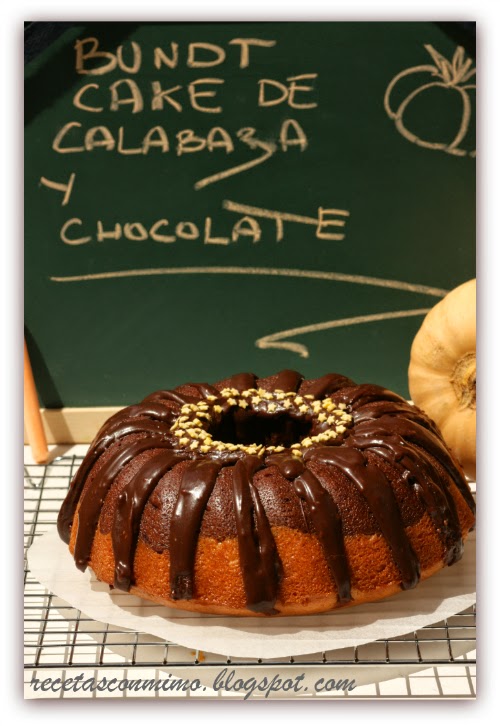 Hace poco me compré un molde para Bundt Cake y por fin me he animado a estrenarlo (que yo voy así, a impulsos; una vez que se me mete en la cabeza hacer algo... lo tengo que hacer sí o sí). Y aquí está, un Bundt cake de calabaza y chocolate, sin huevo como es habitual en casa desde hace un tiempo.