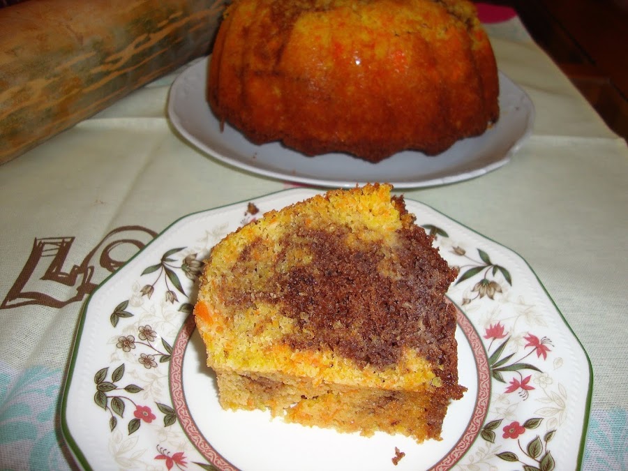 Engrasamos un molde de bundt cake y vamos alternando ambas masas, luego metemos al horno caliente a 170ºC durante unos 50-55 minutos.