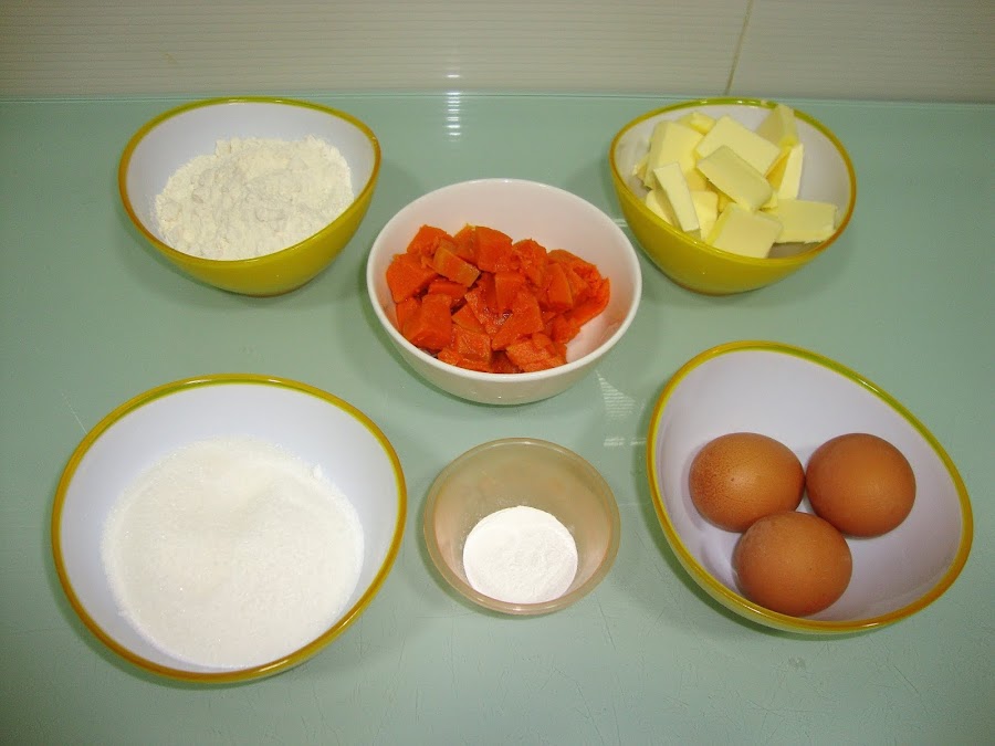 Ponemos en un cuenco el azúcar con la mantequilla y batimos hasta que la masa sea blanquecina y homogénea, añadimos los huevos uno a uno y luego el puré de calabaza. Finalmente añadimos la mezcla de la harina hasta que la masa esté homogénea.