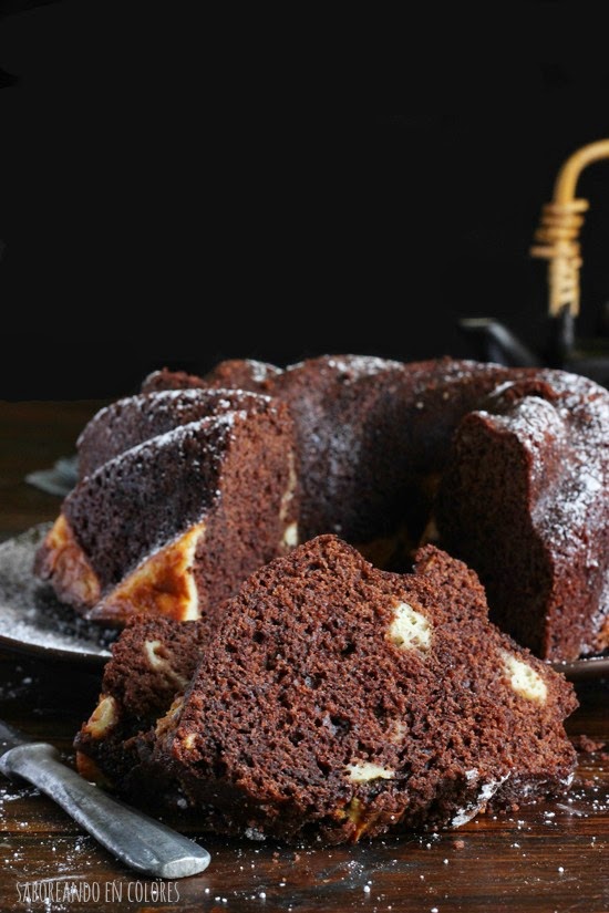 Os puedo asegurar que este Bundt Cake está delicioso. Es esponjoso, el sabor a chocolate es perfecto y los toques del queso lo hacen especialmente rico. Qué más os voy a decir!! Tenéis que probarlo, así es que ahí va la receta, que es mi propia adaptación de varias recetas del estilo que encontré con origen en EEUU: