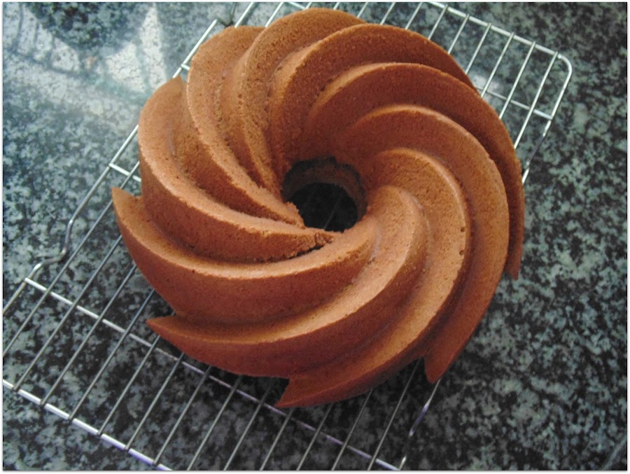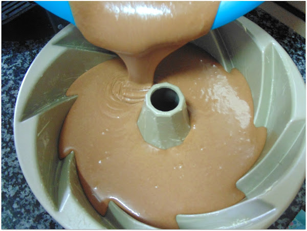 Vertemos en un molde circular previamente engrasado. En mi caso utilicé uno tipo bundt cake, el Heritage de Nordic Ware que me encanta!