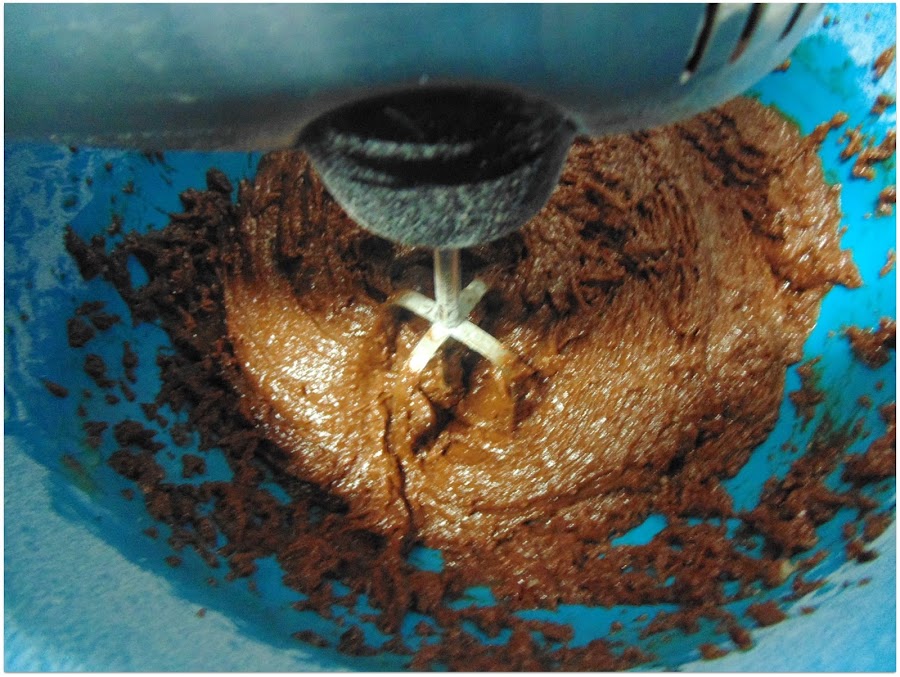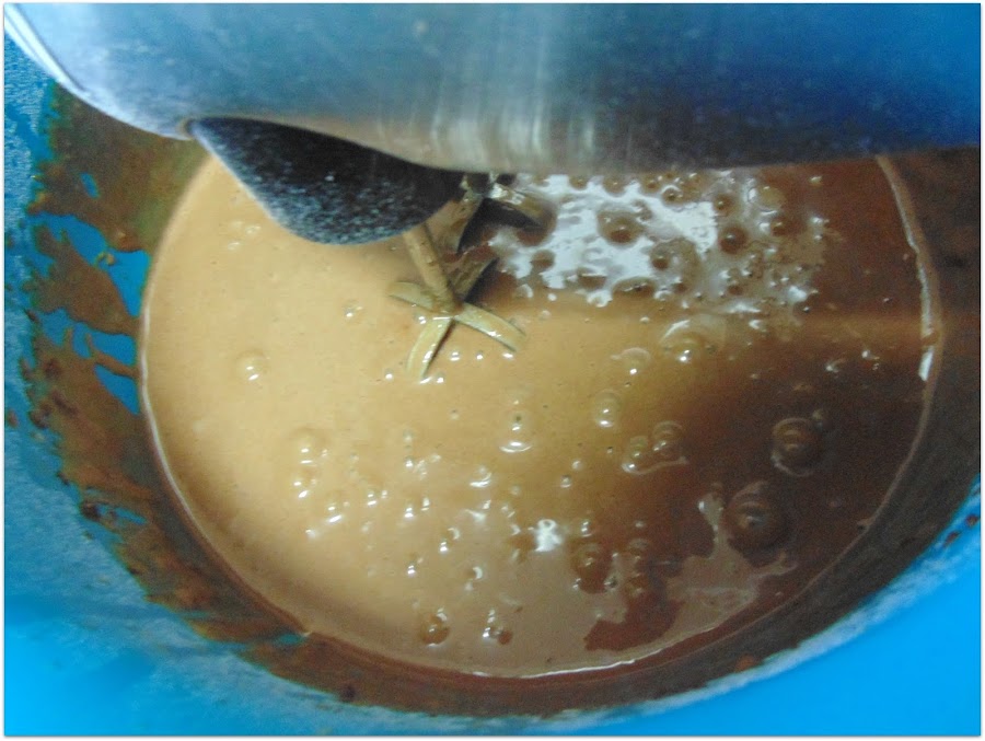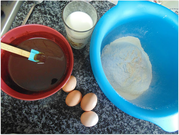Batimos los huevos con el azúcar hasta que espumee. A continuación, agregamos poco a poco la harina con la levadura previamente tamizadas con el toque de sal. Añadimos la mezcla de chocolate y mantequilla y por último la leche sin dejar de batir.