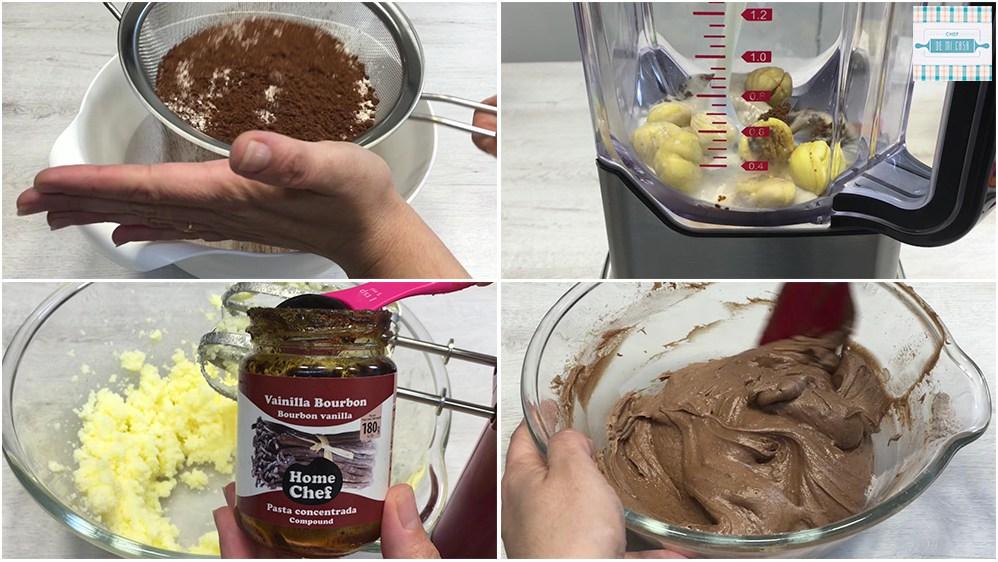 Añadimos 1 cucharadita de pasta de vainilla y continuamos batiendo a la vez que vamos incorporando los huevos de uno en uno. Agregamos el puré de castañas y seguimos batiendo hasta que lo tengamos todo bien integrado.