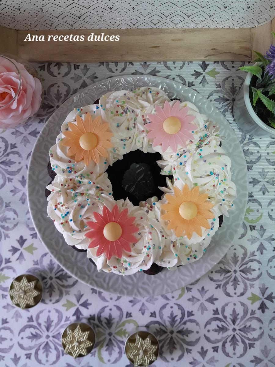 Una vez frío decoramos a nuestro gusto con la nata montada (crema de leche), los nonpareils de colores y las flores de papel comestible.