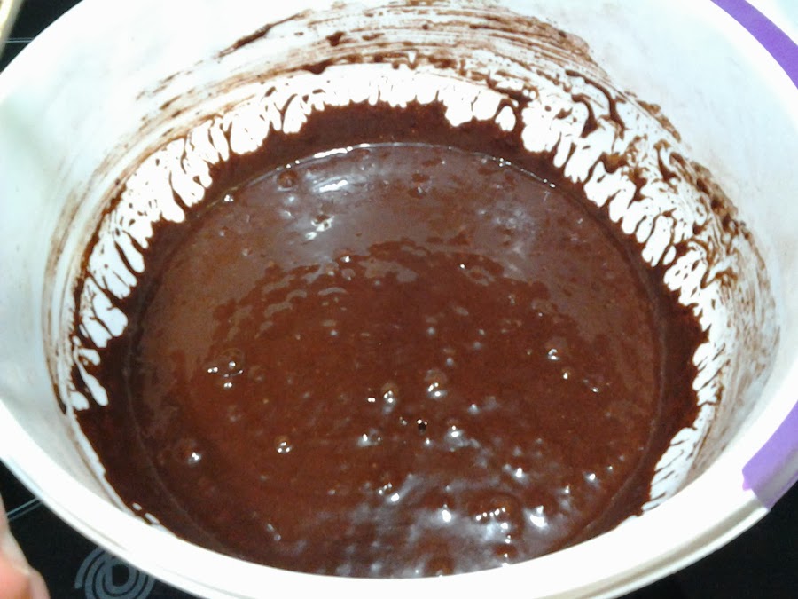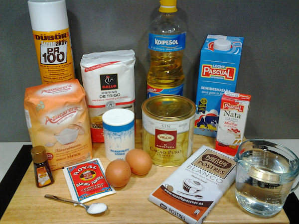 Calentamos el agua y la echamos a la mezcla anterior. Nos quedara una masa liquida. Pulverizamos el molde con el spray y vertemos la masa en el. Lo introducimos al horno precalentado a 175º durante 50 minutos. Yo solo he preparado uno, al contrario que Esmeralda, de ahí que tarde un poquitin mas en estar listo. Antes de sacarlo del horno pinchar con un palillo para verificar que esta cocido por dentro. Dejar enfriar sobre una rejilla. Preparamos el ganache. Calentamos la nata (crema de leche) en un cazo y echamos el chocolate blanco, removemos bien para que quede una mezcla homogénea y dejamos templar.