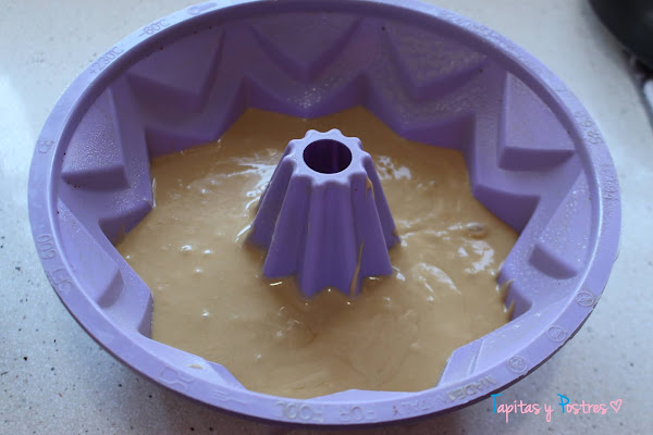 Vertemos la masa en un molde engrasado. Horneamos a 180º, con calor arriba y abajo, sin ventilador, unos 45 minutos.