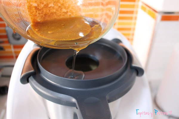 Ponemos el dulce de leche y el aceite en un recipiente apto para el microondas y calentamos unos 20 segundos, para que se puedan integrar bien. Ahora ponemos la thermomix en marcha, sin tiempo velocidad 3 y vamos dejando caer poco a poco la mezcla de aceite y dulce de leche.