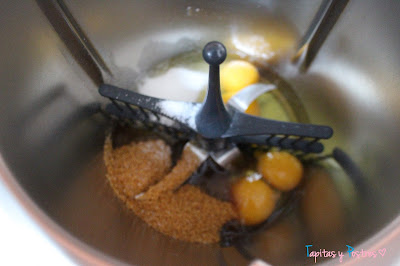 Vamos a poner la mariposa en nuestra thermomix. Ponemos los huevos y las dos clases de azúcar. Programamos 3 minutos, a 37º y velocidad 3. Si no tenemos thermomix batiremos con una batidora de varillas hasta que doblen su tamaño.
