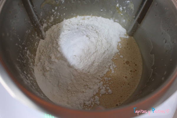 Incorporamos la harina, levadura y sal y volvemos a batir 30 segundos a velocidad 3. Todo el proceso podemos hacerlo perfectamente con una batidora normal.