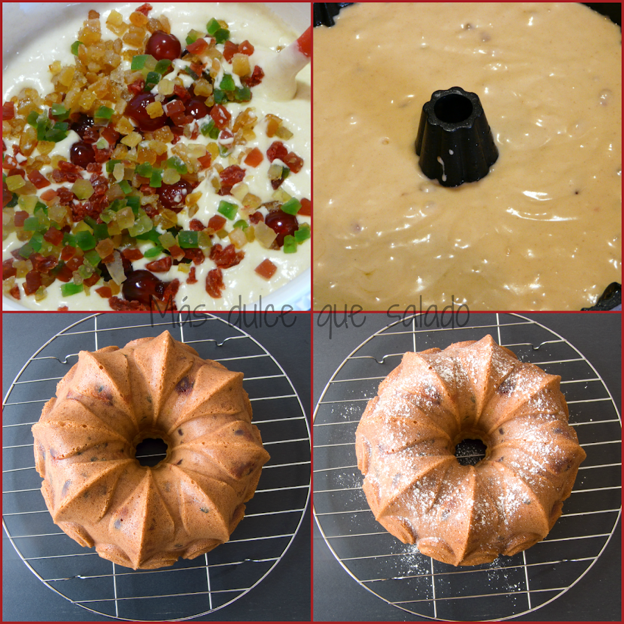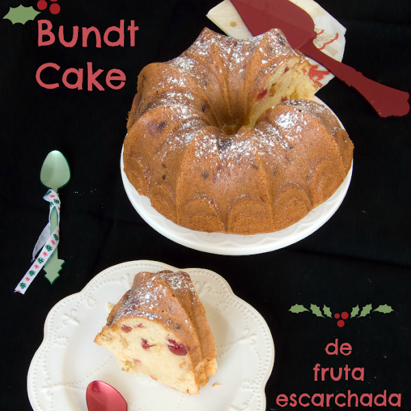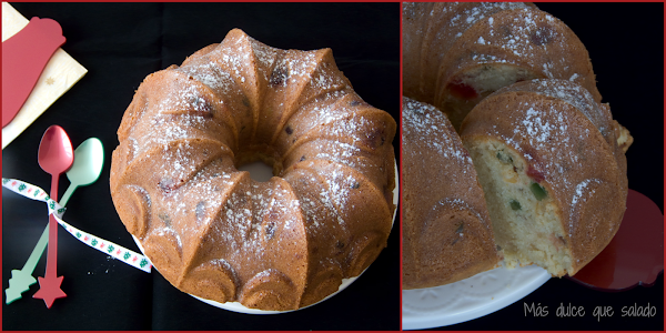 Ya sabéis cómo me gustan los bundt cake... El año pasado me quede con las ganas de hacer esta receta, pero como a mis hijas no les gustan las frutas escarchadas al final desistí. Pero este año no me he podido resistir y como sale un señor bizcocho pues lo he llevado al trabajo para tomarlo con las compañeras.