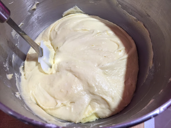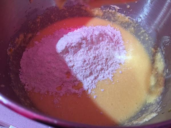 6. A continuación añadimos la harina junto con la levadura en polvo en tres veces a la masa. Batimos lo justo, batir más de lo necesario, nos estropearía la masa.
