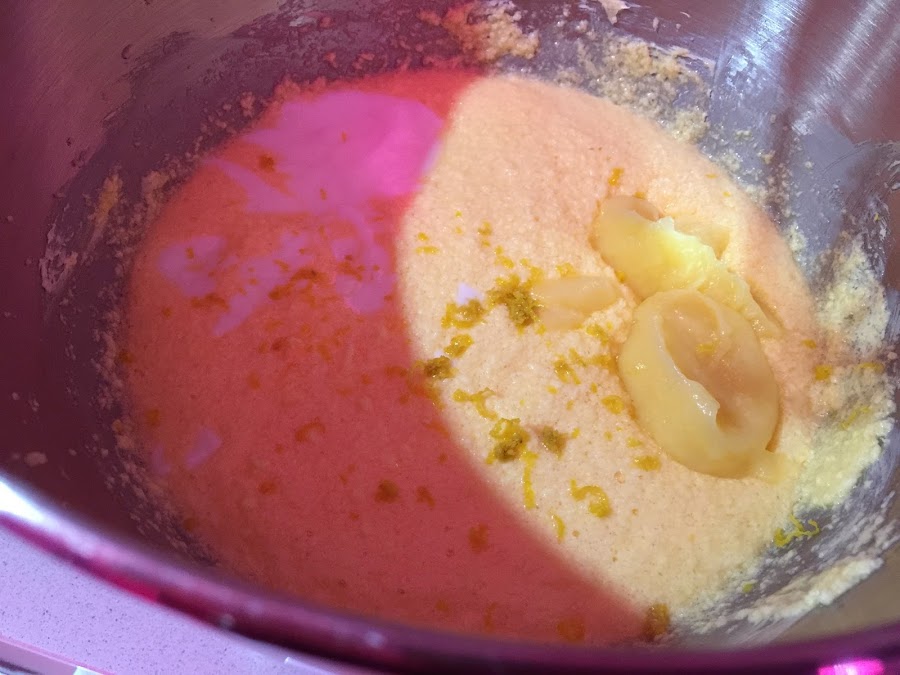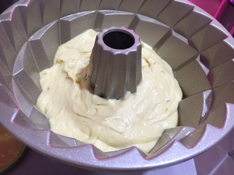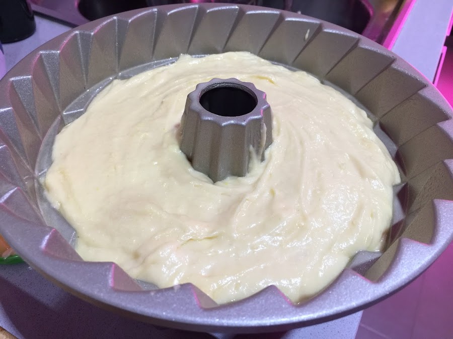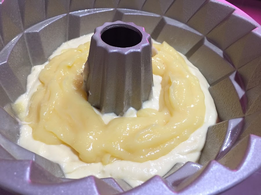 7. Engrasamos el molde y vertemos en él la mitad de la masa de bizcocho. Sobre ella ponemos los 300g de lemon curd. Es importante que el lemon curd quede centrado y envuelto por masa, que en ningñun caso toque los bordes del molde. Añadimos encima la mitad de masa de l bizcocho, cubriendo por completo el lemon curd. Alisamos la superficie del bundt cake.