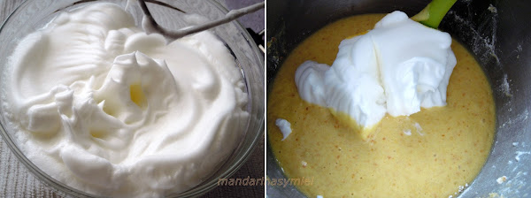 Une el merengue con las masa de mandarinas, mezcla con movimientos envolventes para que no se bajen las claras y pierdan volumen.
