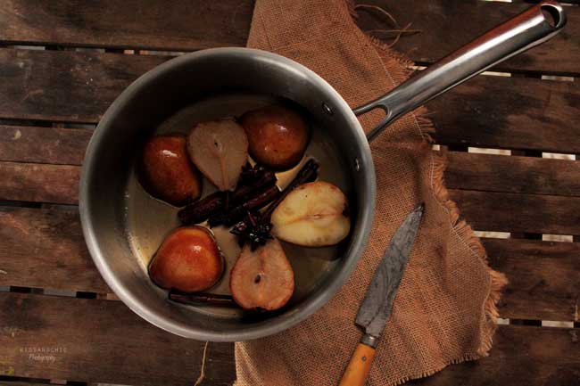 Starts with syrup pears . Place the pears in halves in a saucepan with sugar, star anise, cinnamon stick and water. Put on medium heat until the soft syrup is made