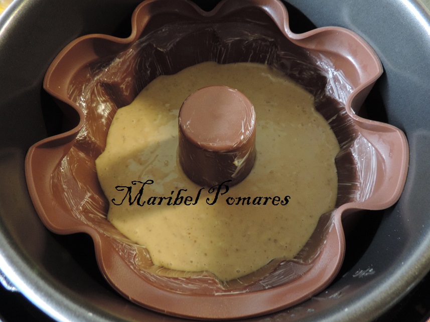 Ponemos el molde untado con mantequilla dentro de la cubeta de la olla, echamos la mezcla dentro.