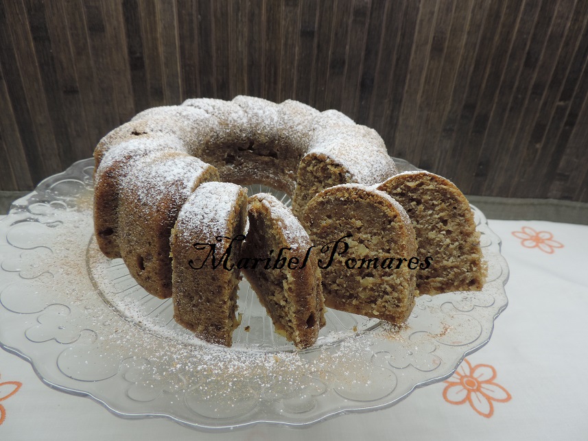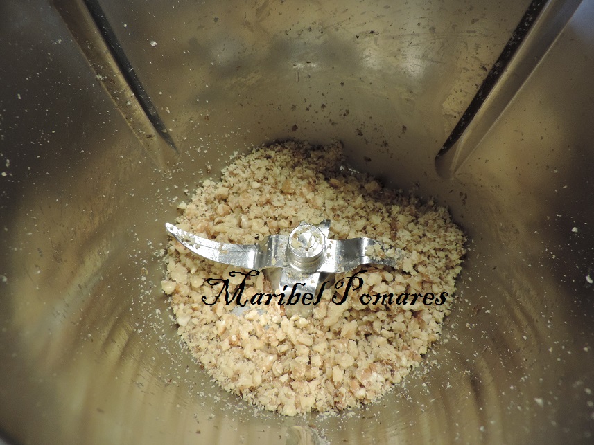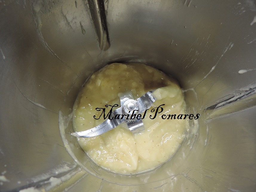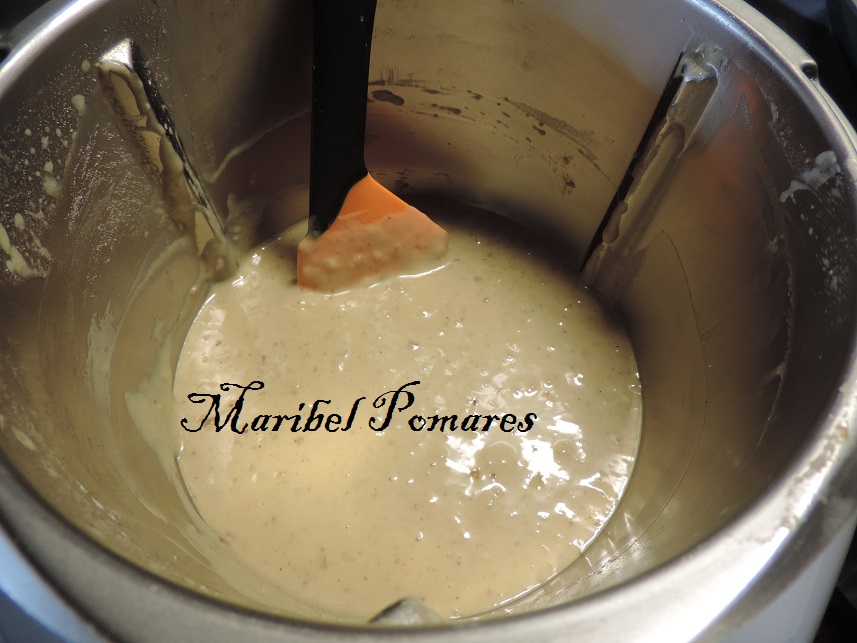 Ahora programamos 4 minutos, velocidad 3 y 1/2, y añadiremos por el vocal la mantequilla, canela, esencia de vainilla, harina y levadura tamizadas, los plátanos picados y las nueces.
