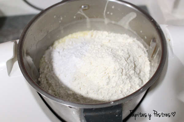 Incorporamos la harina y la levadura y mezclamos muy bien 1 minuto a velocidad 5, hasta que quede una crema homogénea.