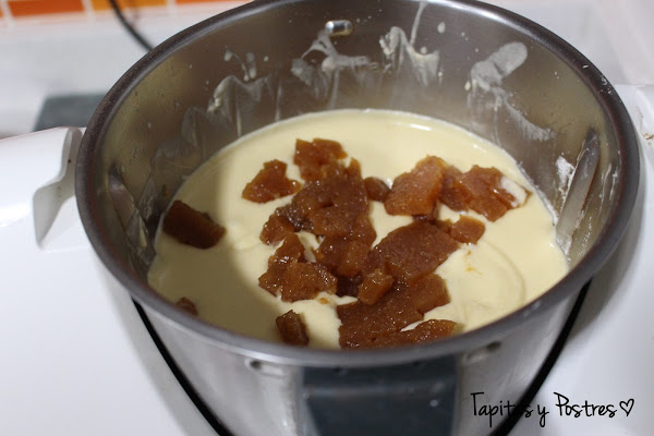 Cortamos el membrillo en trocitos y lo añadimos removiendo ahora con una espátula.