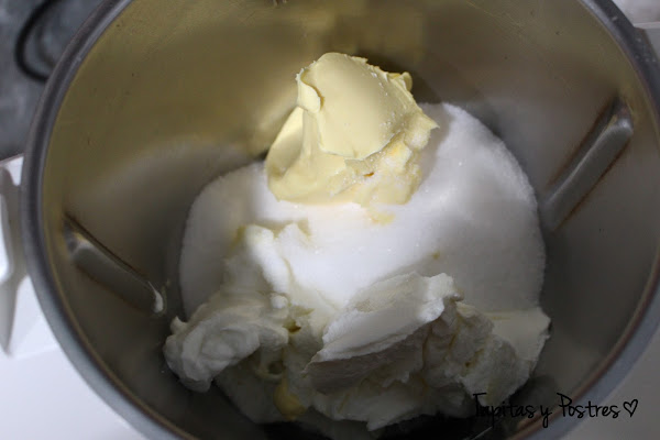 En el vaso de la thermomix batiremos la mantequilla, el azúcar y el queso durante 3 minutos a velocidad 4.