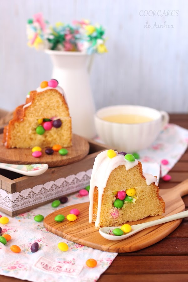 El Bundt Cake que os he preparado para hoy es de esos que resultan más que perfectos para una fiesta de cumpleaños. Me lo imagino, en su cake stand, en el centro de la mesa, y cuando se da el momento de cortarlo.... pum, una explosión de color sale de su interior. No me digáis que los más peques, y los no tan peques, se quedarían alucinados!