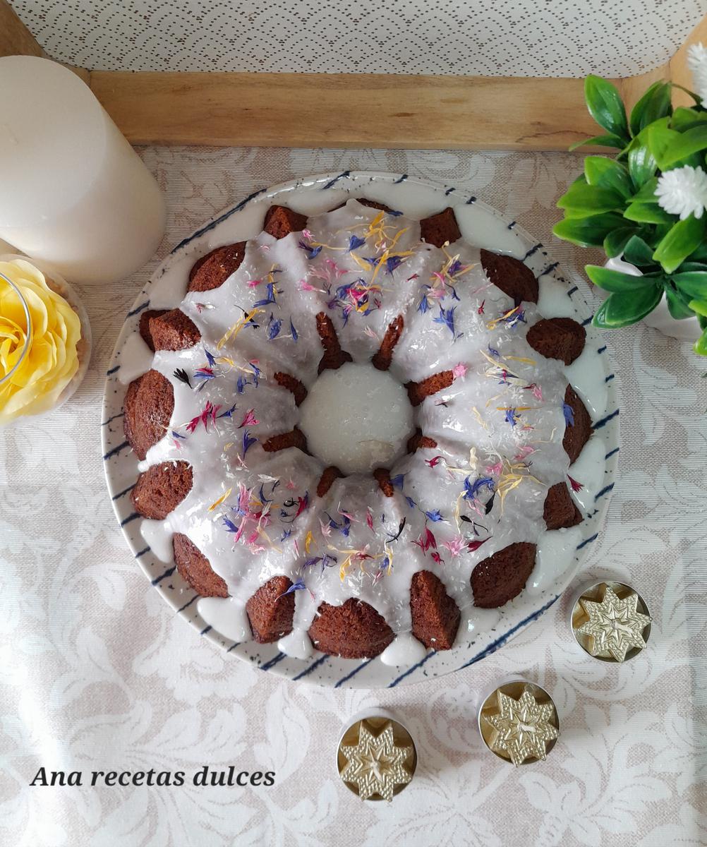 Echamos el glaseado por encima del bizcocho con la ayuda de una cuchara en forma de zig zag y decoramos a nuestro gusto (yo le he espolvoreado coco rallado y flores comestibles).