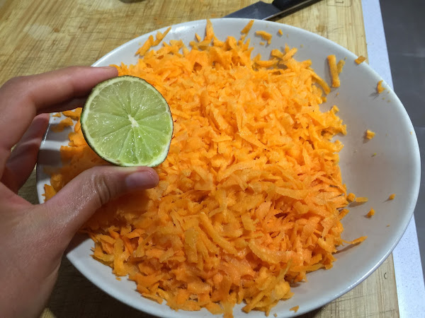 1. Pelamos y lavamos las zanahorias. Rallamos las zanahorias. Una vez rallada le añadimos un poco de zumo de lima y reservamos. La manzana la pelaremos y rallaremos justo en el momento que incorporemos las zanahorias a la masa, así evitamos que empiece a oxidarse.