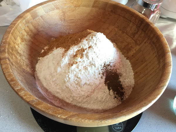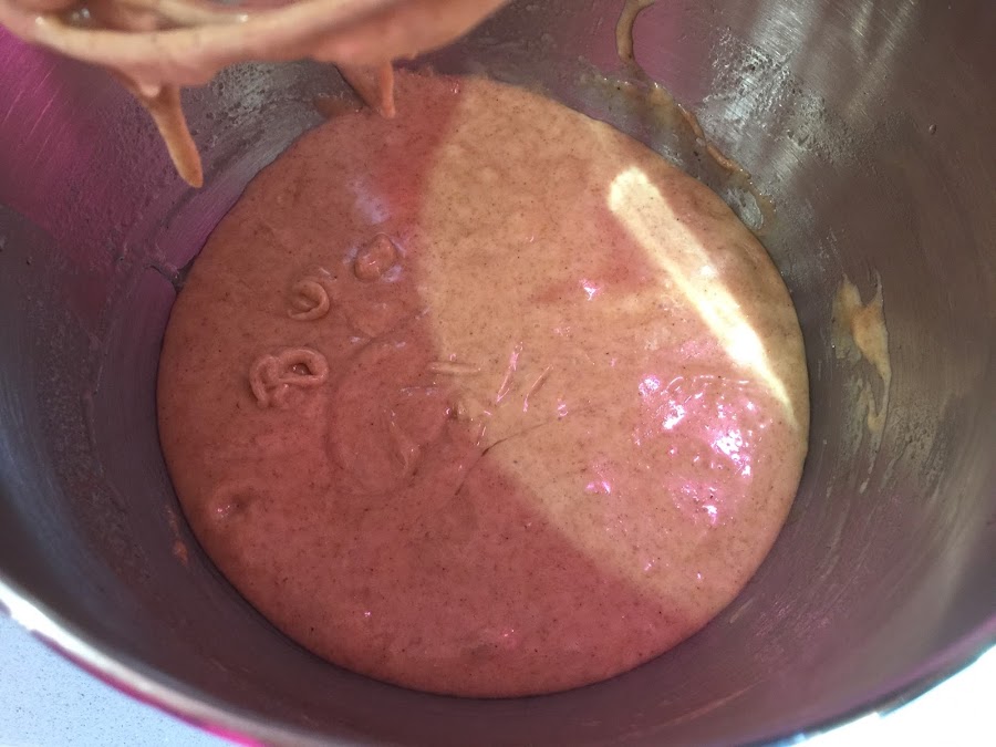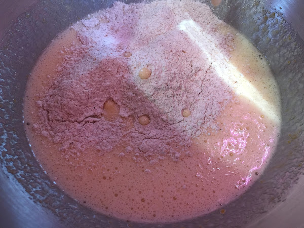 3. En otro bol mezclamos todos los ingredientes sólidos. La harina integral, la sal, las especies, la levadura y el bicarbonato. Añadimos la mezcla de ingredientes sólidos y mezclamos lo justo para que se integren.