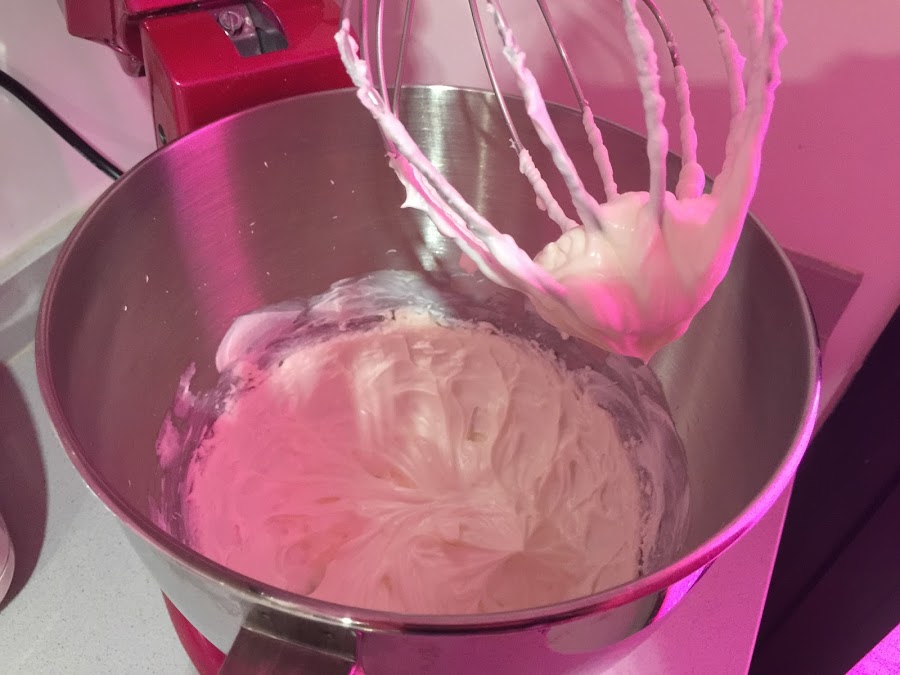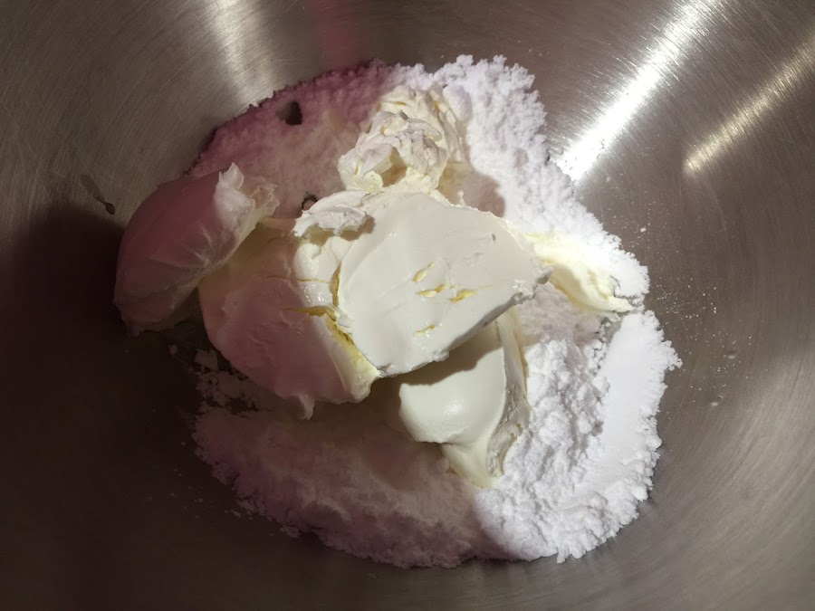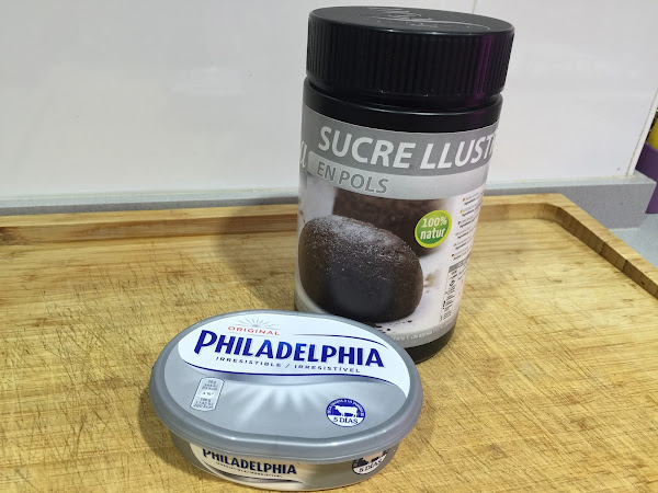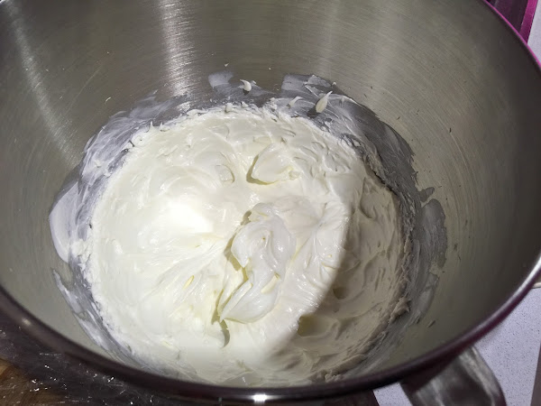 9. Al día siguiente poco antes de servirlo preparamos el frosting de queso. Para ello batimos los 200g de queso philadelphia junto con los 100g de azúcar glass. Interesa batir muy bien durante un buen rato, así ganará volumen y quedará más cremosa.