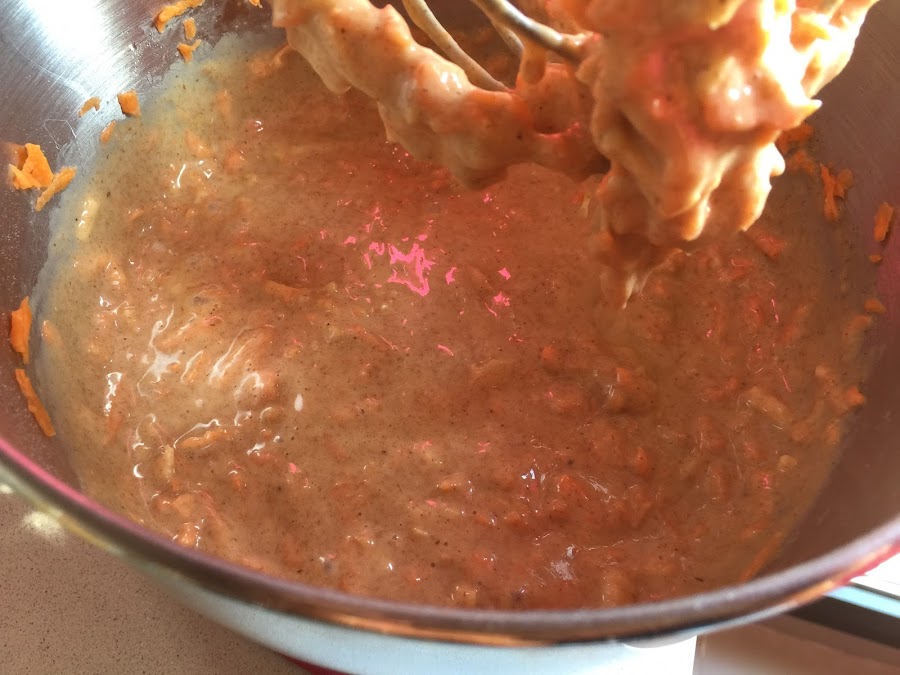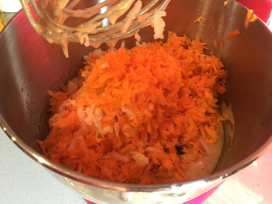 5. Lavamos, pelamos y rallamos la manzana. Seguidamente añadimos la zanahoria y la manzana rallada a la masa del bizcocho. Batimos lo justo para integrarlas en la masa.
