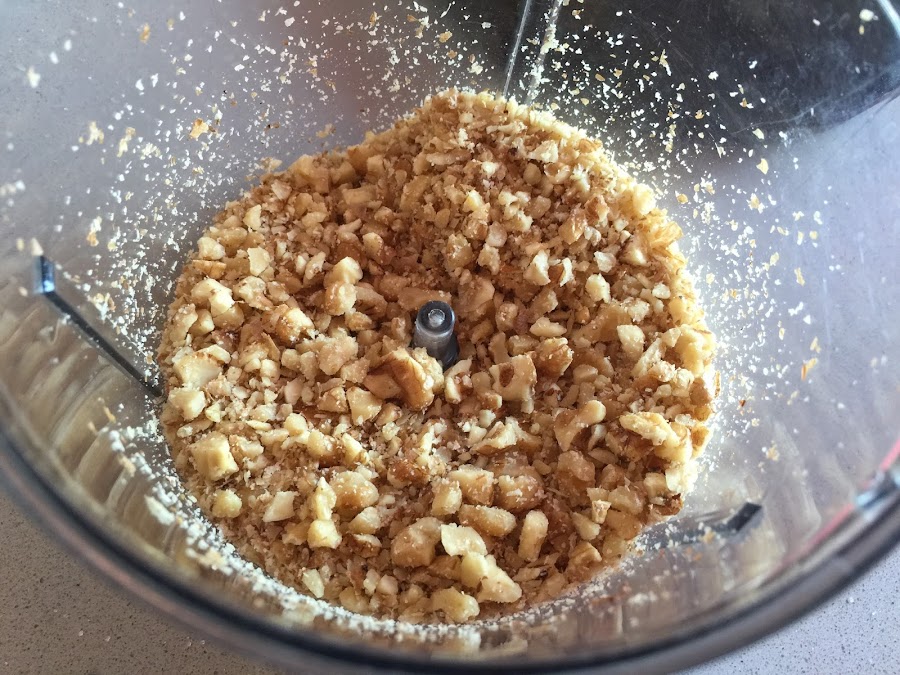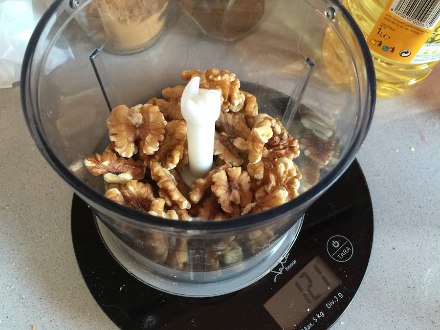 6.Trituramos un poco las nueces y las añadimos a la masa de nuestro bizcocho.